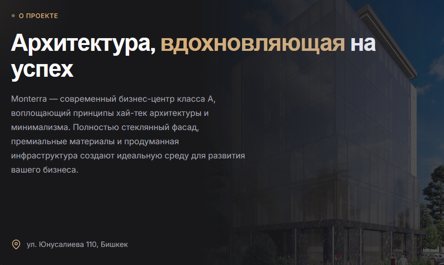 Monterra — современный бизнес-центр класса А, воплощающий принципы хай-тек архитектуры и минимализма. Полностью стеклянный фасад, премиальные материалы и продуманная инфраструктура создают идеальную среду для развития вашего бизнеса.